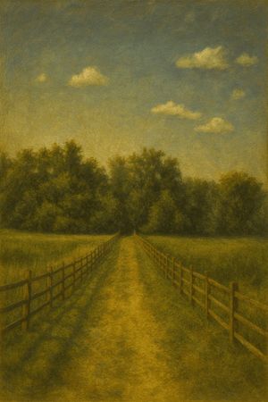 A quiet trail stretches forward between two fences, framed by green fields and trees under a calm blue sky. This realism-style artwork captures the peace of a summer day — still, open, and full of clarity. The warm painterly tones and soft light remind us that progress doesn’t always come from rushing ahead — sometimes, it’s found in the steady steps forward. Perfect for anyone who values reflection, simplicity, and the beauty of nature’s balance.